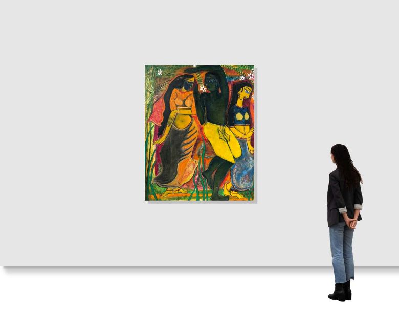 Uma Gautam, a self-taught artist from Bangalore, is known for her unique blend of spiritual and personal introspection in her art. Known for exploring mystical and spiritual themes through religious iconography, Gautam often depicts figures such as Jesus Christ, Buddha, and Lord Shiva in her works. In this painting, the artist explores the human connection, imbuing the subjects with a sense of the divine.