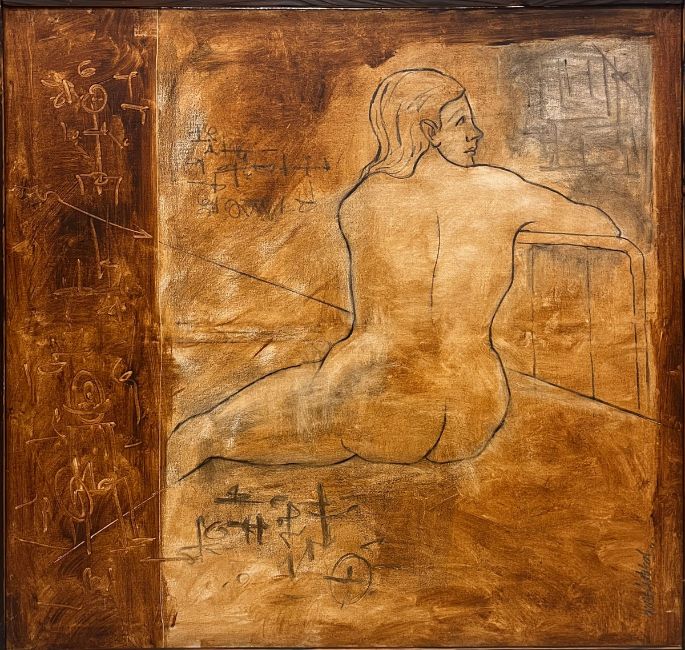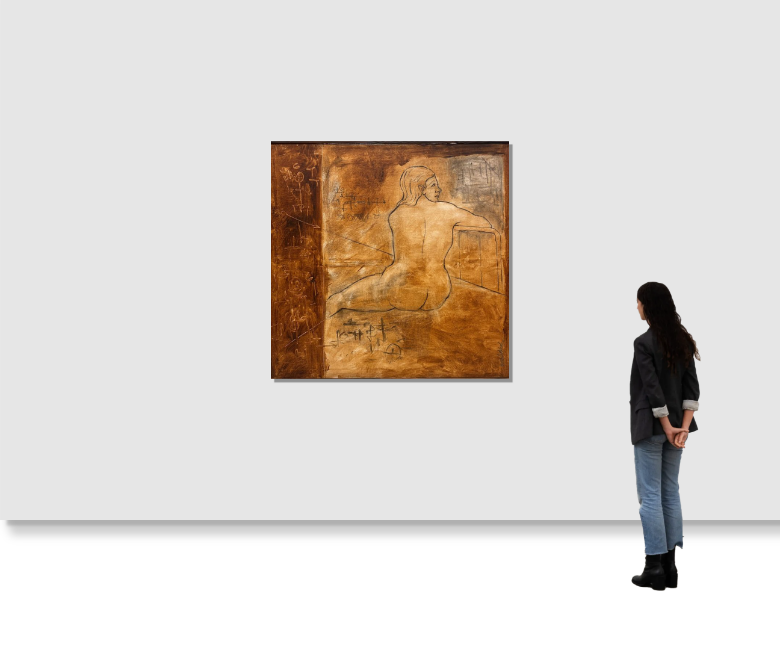 Yusuf Arakkal’s early abstract paintings depict city dwellers with a vibrant array of colours. Over time, his focus shifted to social issues capturing the everyday lives of the dispossessed in urban areas. Through somber shades and textured canvases reminiscent of weathered walls; he portrayed their poverty and resilience. Arakkal’s artworks, like this one often feature solitary figures evoking contemplation on the human condition. Arakkal’s palette embraces earthy tones occasionally accented by touches of yellow or crimson as observed in this work.