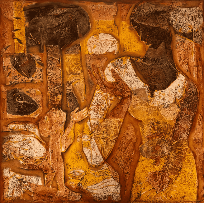 Basavaraj L. Jane, a Gulbarga-based artist is known for his evocative exploration of human emotions particularly focusing on the resilience and struggles of women. His background in the culturally rich region of Karnataka informs his deeply introspective and layered works which blend abstract and figurative forms using overlapping colors like red orange and yellow to convey complex emotions. Through his distinct use of vibrant and somber tones Jane captures the nuances of the human condition offering a poignant reflection on personal and collective experiences.