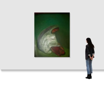 Pal's work was characterized by bold colors dynamic compositions and a focus on the female experience. This oil on canvas captures the nurturing bond between mother and child set against a vibrant green backdrop.