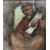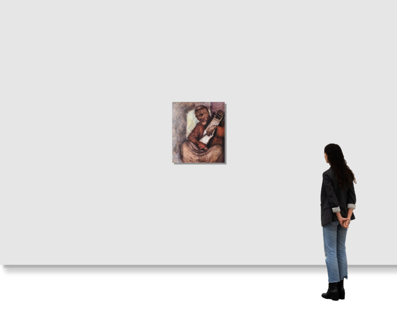 This work depicts a sarangi player, a subject rooted in Indian classical and folk music traditions. The sarangi has long been associated with both Hindustani vocal accompaniment and regional storytelling forms like Baul and Manganiyar. Maiti, trained in Kolkata and known for documenting vernacular musicians and laborers, uses layered washes and graphic lines to reflect the earthy immediacy of his subjects.