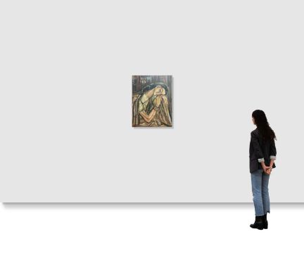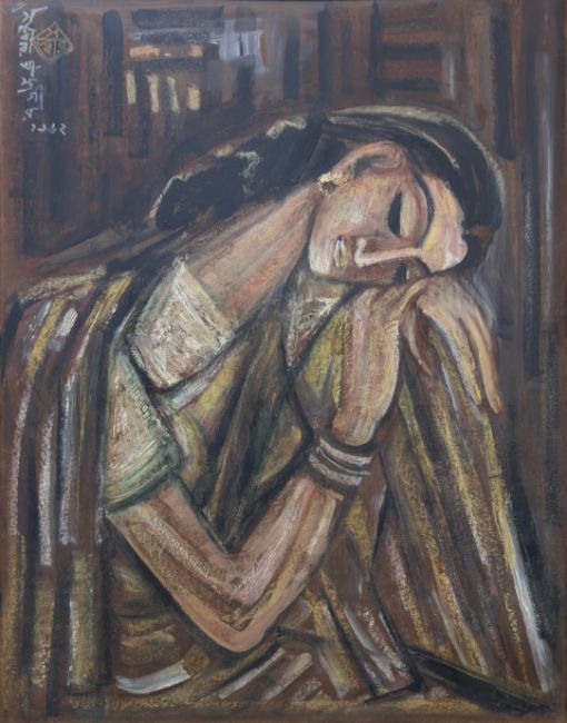 Sudhir Khastgir was a prominent artist and a key figure of the Bengal School of Art. Educated at Visva-Bharati University in Santiniketan under Nandalal Bose and Abanindranath Tagore, he made notable contributions to Indian art. His work, often in watercolours, oils, and sculptures, reflects a deep connection to Indian mythology, women and village life. Central to many of his compositions are women often depicted in reflective poses, such as in this lot. His use of rich, earthy tones and dynamic brushstrokes brings these scenes to life, capturing the delicate interplay of light and shadow.