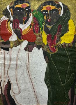 The women depicted in Thota Vaikuntam’s paintings often adorn themselves with omnipresent vermilion “bindis” and are elegantly draped in colourful sarees. Thota Vaikuntam’s artworks reflect the purest essence of the women from the Telangana region. He captures their authentic beauty by paying attention to their colours and the intricate decorative motifs on their clothing. The paintings also showcase the significance of hasta mudras (hand gestures) and the exquisite jewellery they wear. Through his art Vaikuntam eloquently conveys the rich and distinctive feminine lifestyle of the region providing a compelling glimpse into its cultural heritage.