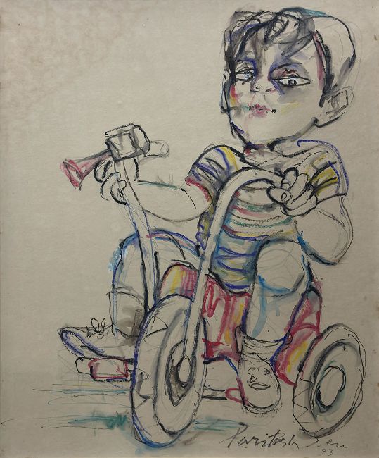 Paritosh Sen (b. Dhaka) was a founding member of the Calcutta Group and studied at the Government College of Arts and Crafts Chennai before furthering his education at the Ecole de Beaux-Arts in Paris. His work influenced by cubism and fauvism features strong lines bold strokes and a mastery of two-dimensional planes that create an illusion of voluptuousness. Sen often focused on the human figure capturing scenes from urban life. His vibrant use of color brings depth and energy particularly in his depictions of children engaged in playful activities as seen in this lot.