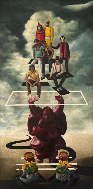 Kanchan Das Gupta is a painter from Kolkata and studied at the Government College of Art and Craft. His large canvases combine realistic detail with unconventional figures creating compositions that feel both sardonic and serene. Often working with a monochrome palette he adds bold colors to break the stillness. Known for his figurative style Das Gupta captures raw human emotion portraying individuals clinging to their dignity in tragic moments. His innovative use of color affirms his distinct position as a non-traditional artist.