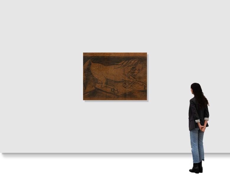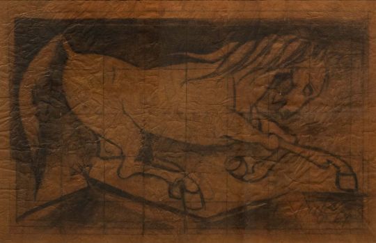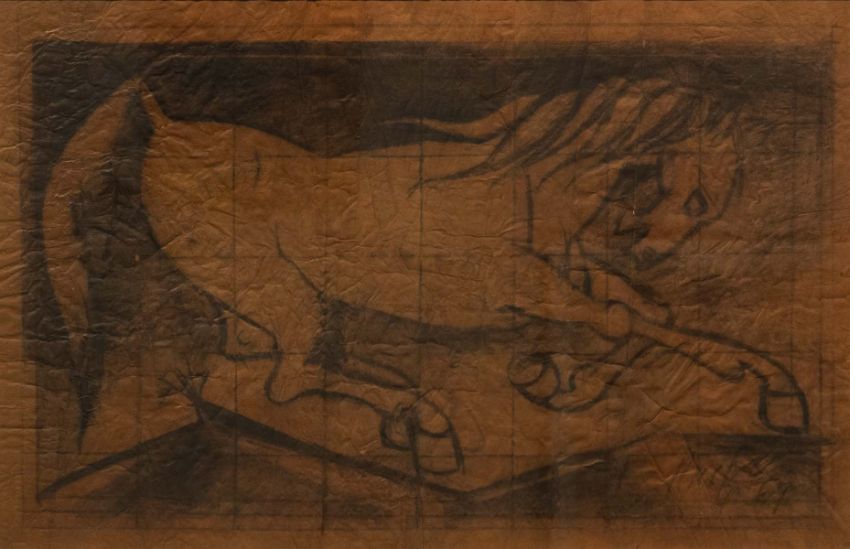 A. A. Raiba (1922 - 2016) 30 x 40 Inches Charcoal on Paper Signed Lower Right Year - Circa 1965 "Raiba consistently wielded charcoal as his chosen medium for sketching and his approach to lines evolved in tandem with his subjects over the years. This charcoal on paperwork from the artist’s estate was made in the 1960s. Early in his career, he portrayed Christ, nude studies, and the erotic using sharp angular shapes teetering on the edge of cubism without fully embracing it. In a later series featuring landscapes and portraits of rural life Raiba's lines took on a lively curvaceous quality reminiscent of the styles employed by Mexican Muralists. Perhaps it was this dual training at the JJ School of Art in Western and Indian painting techniques coupled with his scholarly and introspective nature birthed a distinctive style and technique that set his work apart from his contemporaries.For further information on the artist, click here.