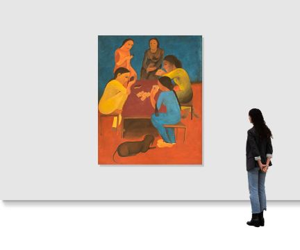 Gogi Saroj Pal (1945 - 2024) Oil on canvas 62 x 50 Inches Signed Lower Left Gogi Saroj Pal's oeuvre spanning over five decades is a powerful exploration of womanhood focusing on the lives emotions and complexities of women. Recognized as one of the early feminist artists in modern Indian art her paintings frequently engage with the desires and struggles of the feminine world. Born in what was then the United Provinces of British India Gogi Saroj Pal began her art studies in rural Rajasthan before moving on to Lucknow and eventually Delhi where she taught and settled. In this lot Gogi portrays women in a moment of leisure and independence capturing their autonomy and self-assuredness. This piece reflects her broader exploration of women's agency. Her art including iconic series like "Being a Woman" "Mandi" and "Nayika" portrays women in empowering postures and expressions rejecting passivity in favor of active self-assertion. By blending traditional Indian imagery with modern feminist themes Gogi created a distinctive visual language that speaks to both the struggles and triumphs of women. Her work remains a powerful commentary on gender identity and the need for change.