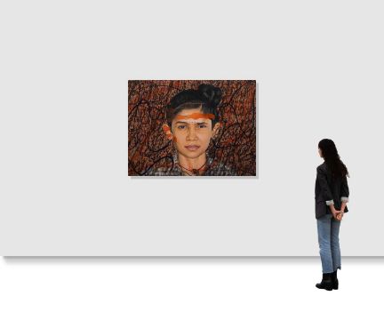 George K. (b. 1950)Oil on canvas36 x 48 InchesYear - 2007Provenance - Private Collection MumbaiPublished - Born In Faith Apparao 2009 pg. 120George K. a business professional turned artist brings a multidisciplinary approach to his work which includes sculpture painting and photography. His creative practice is deeply rooted in his photographic compositions. George K.'s paintings are introspective explorations of human existence. His subject matter is often local and human-centered portraying vibrant scenes of daily life such as vendors priests and ordinary people. These images are further defined with text or verse adding depth and context. He begins by digitally photographing an image then translates it into an oil painting often with altered colours. The final step involves adding layers of text and graffiti creating a rich interplay of imagery and words. His paintings are characterised by their realistic style layered with postmodern graffiti. This particular work reflects his keen sense of observation and his ability to capture split-second emotions translating them into a complex philosophical narrative on canvas. The central figure combined with repeated verses or words creates a powerful visual mantra.
