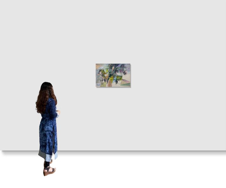 This large-format work reflects Arup Das’s late-period engagement with layered figuration, architectural forms, and abstraction. The composition combines drawing and pigment in a manner typical of his mature mixed-media practice.