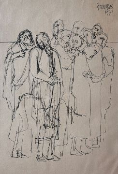 This ink drawing reflects Das’s sustained engagement with the human figure as a symbol of collective emotion and spiritual inquiry. The sparse, expressive linework and close grouping of forms echo his broader interest in shared experience, memory, and introspection—key themes across his practice in the 1970s.